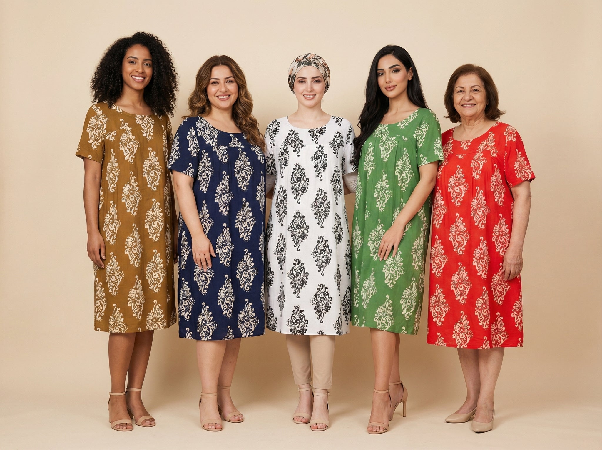 - A short-sleeved midi dress with a relaxed, modest silhouette, featuring classic paisley patterns in five color schemes: brown-beige, navy-beige, black-white, green-beige, and red-beige.