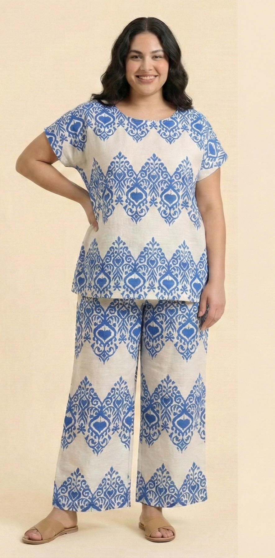 - The fabric has a lightweight, textured finish (likely linen-cotton blend), breathable and suitable for warm weather. The matching top-pants set ensures styling coherence, and the loose cut offers unrestricted movement.