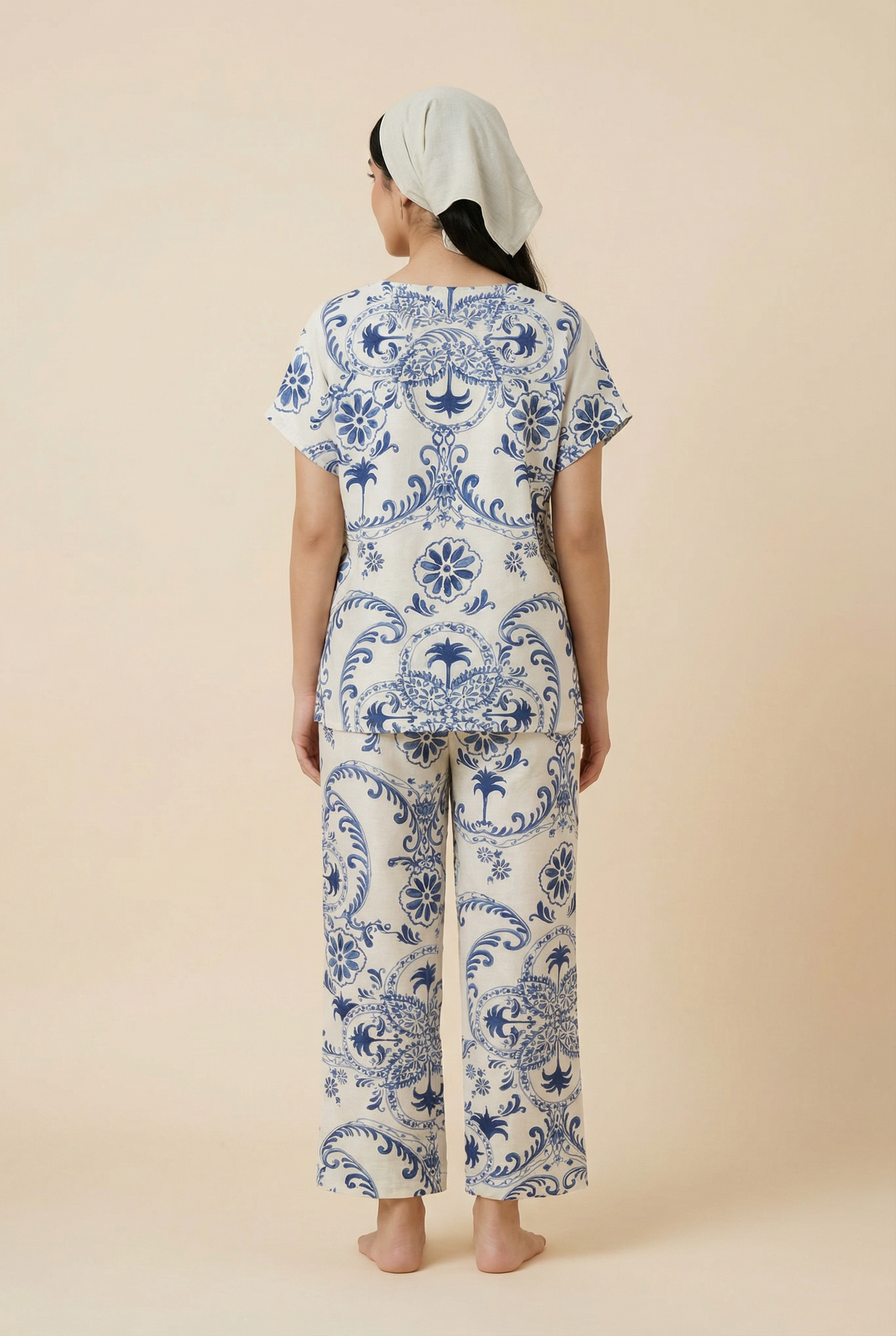 - A two-piece loungewear set (short-sleeved tunic top + cropped wide-leg pants) featuring intricate mosaic-style patterns (blending floral and geometric motifs) in two color schemes: brown-beige and blue-white.
