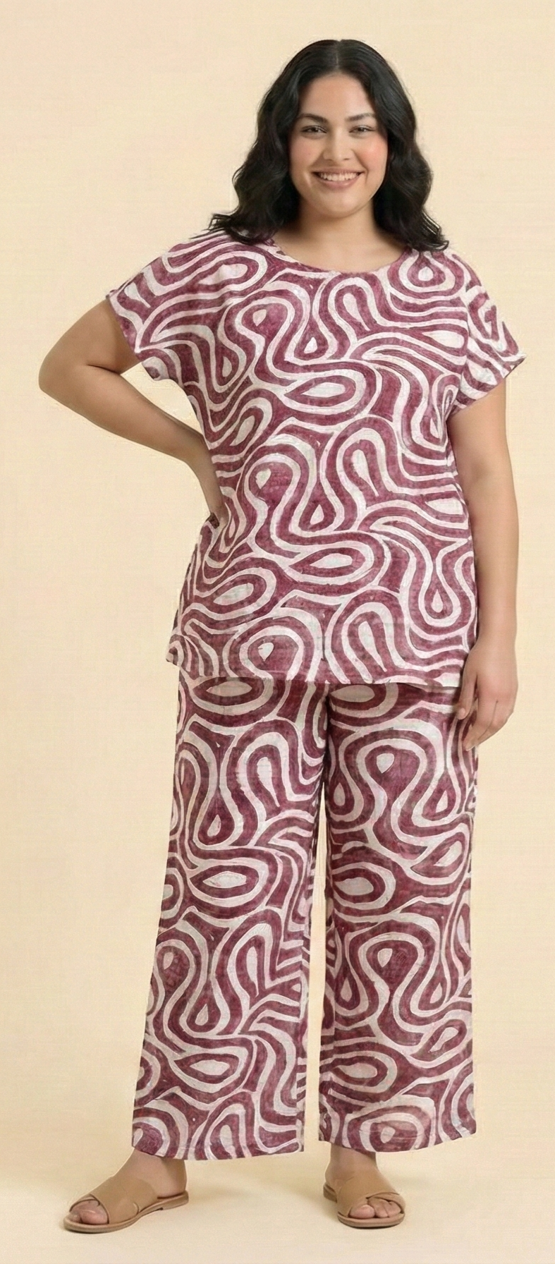 - A two-piece loungewear set (short-sleeved tunic top + wide-leg pants) featuring flowing organic wave patterns in four color schemes: brown-beige, black-white, olive-green-beige, and red-beige.