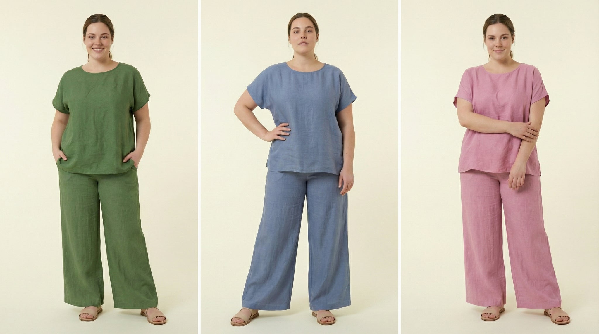 - A two-piece loungewear set (short-sleeved top + wide-leg pants) available in three muted tones: olive green, dusty blue, and mauve pink.