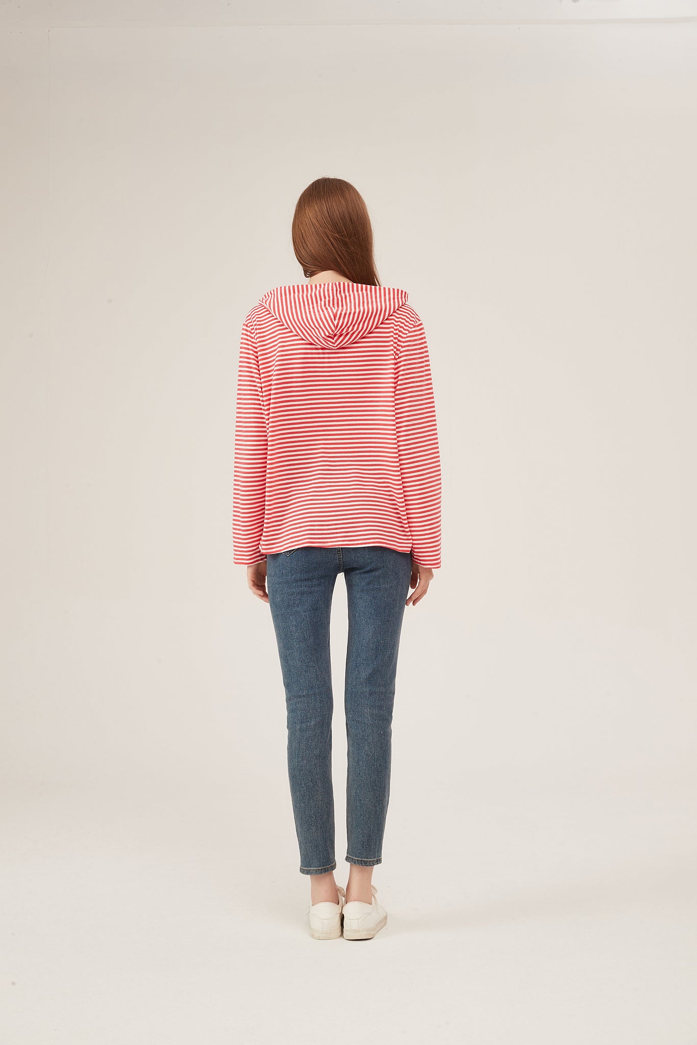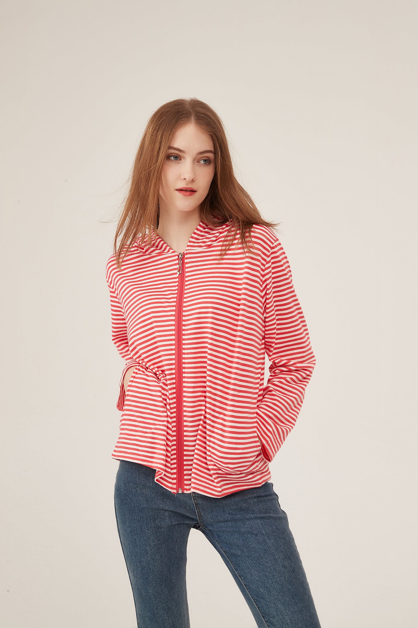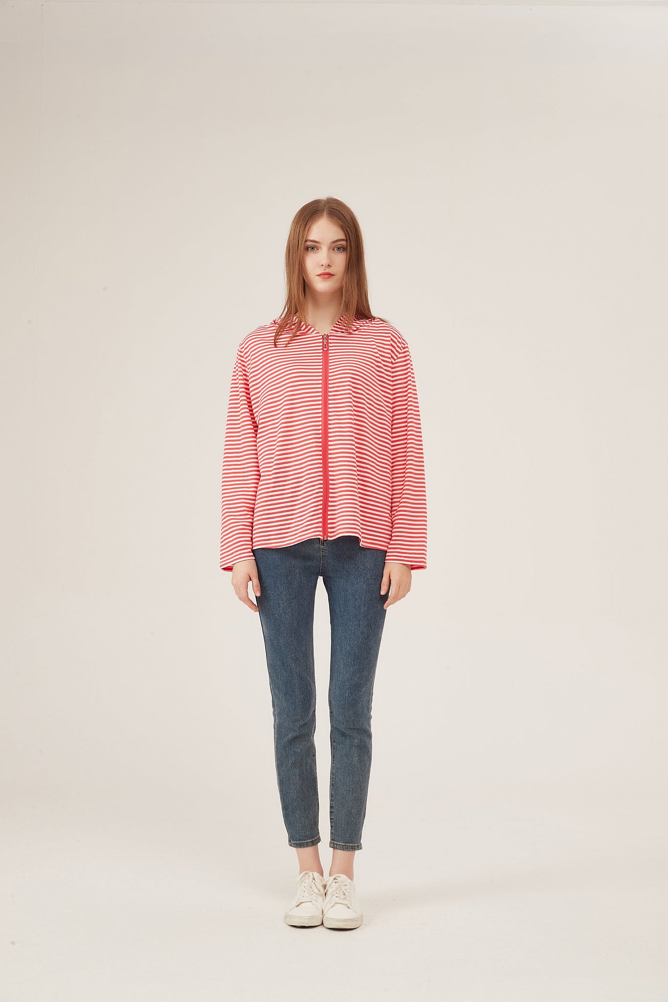 This vibrant red-and-white stripe zip-up hooded jacket blends casual energy with effortless versatility, making it a standout layer for everyday styling. The classic horizontal stripe pattern (bold red paired with crisp white) delivers a playful, timeless vibe, while the full-zip front and attached hood add practicality and relaxed charm. The lightweight, soft fabric ensures comfort, and the oversized fit flatters all body types—featuring side pockets for added functionality. It pairs seamlessly with denim jeans, shorts, or dresses, ideal for casual outings, errand runs, or cool-weather layering. This piece balances bold, eye-catching design with everyday wearability, serving as a versatile staple for casual wardrobes.