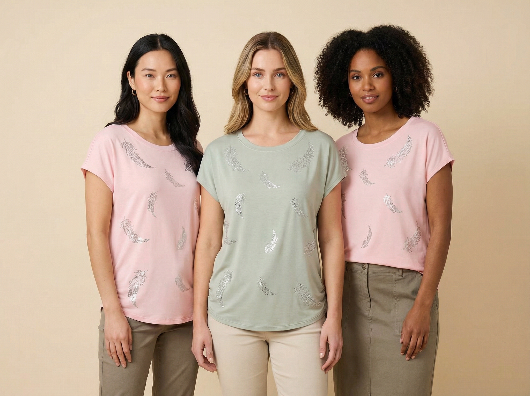 - Design Details: Features delicate sequin-feather patterns (shimmering yet understated), adding a light, airy touch; the relaxed fit and crew neck ensure comfort while maintaining a flattering silhouette.