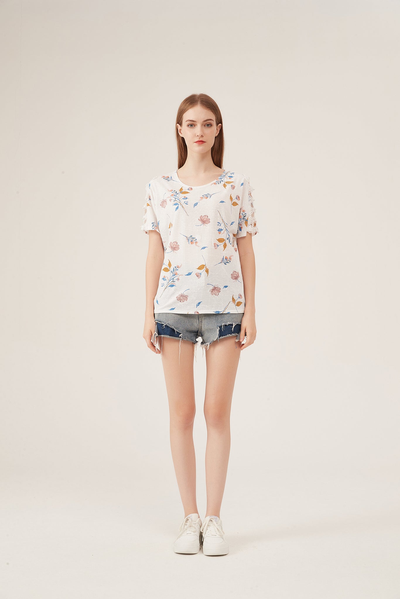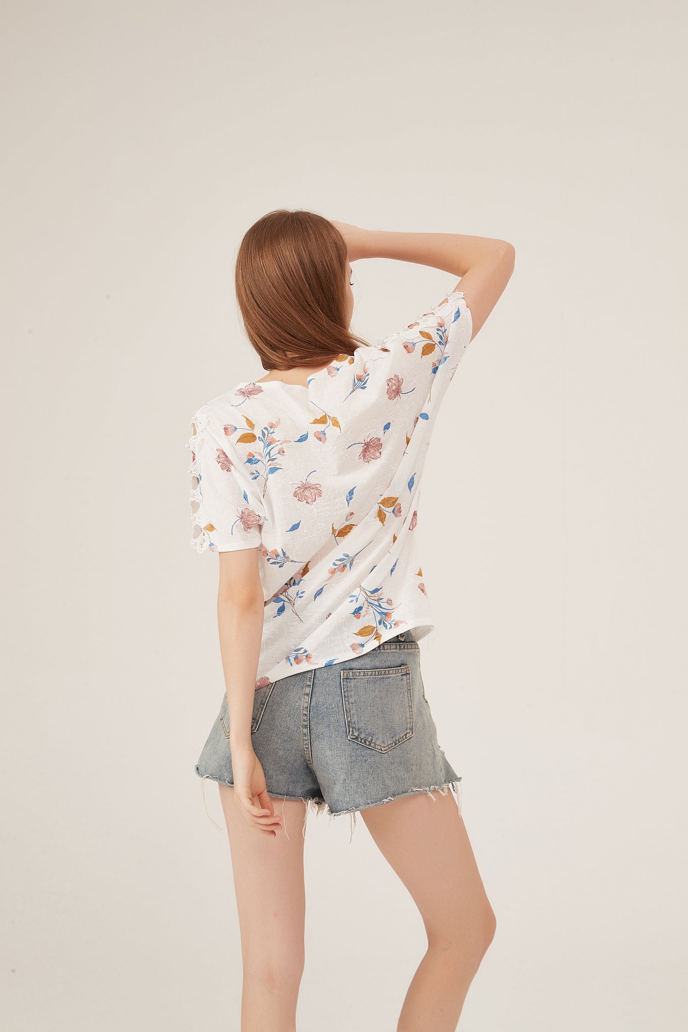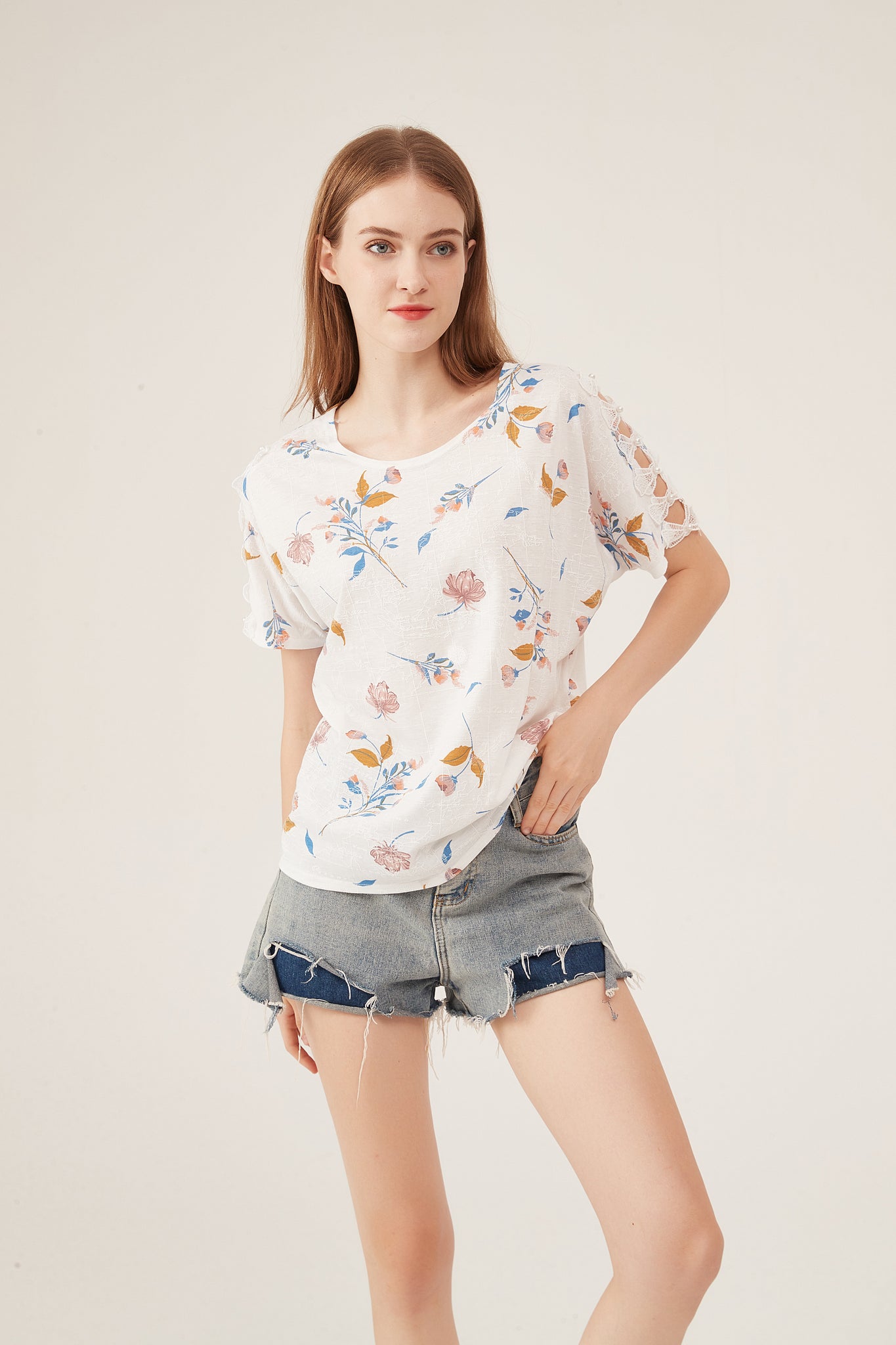 This loose white blouse combines dreamy aesthetics with effortless comfort, perfect for crafting relaxed, refined looks. It features a delicate watercolor floral print—soft pink blooms, muted blue leaves, and warm golden accents scattered across the fabric, lending a gentle, spring-inspired charm. The batwing sleeve design adds a flowy, relaxed silhouette, while the lightweight, linen-like fabric offers exceptional breathability (ideal for warm weather) and a subtle texture that elevates the casual style. The oversized fit flatters all body types and pairs seamlessly with denim shorts, high-waisted skirts, or cropped trousers, making it suitable for weekend brunches, casual outings, or laid-back office days. This piece balances understated elegance with everyday versatility, becoming a staple for easy, polished outfits.