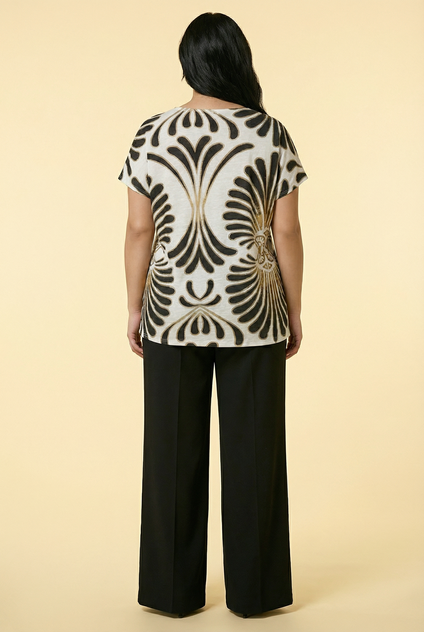 - Design Details: Features bold, symmetrical fan-shaped patterns (echoing Art Deco’s geometric elegance) with layered linework—creating a sophisticated, eye-catching visual while maintaining a balanced, cohesive look. The relaxed fit and rounded neck ensure effortless wearability.
