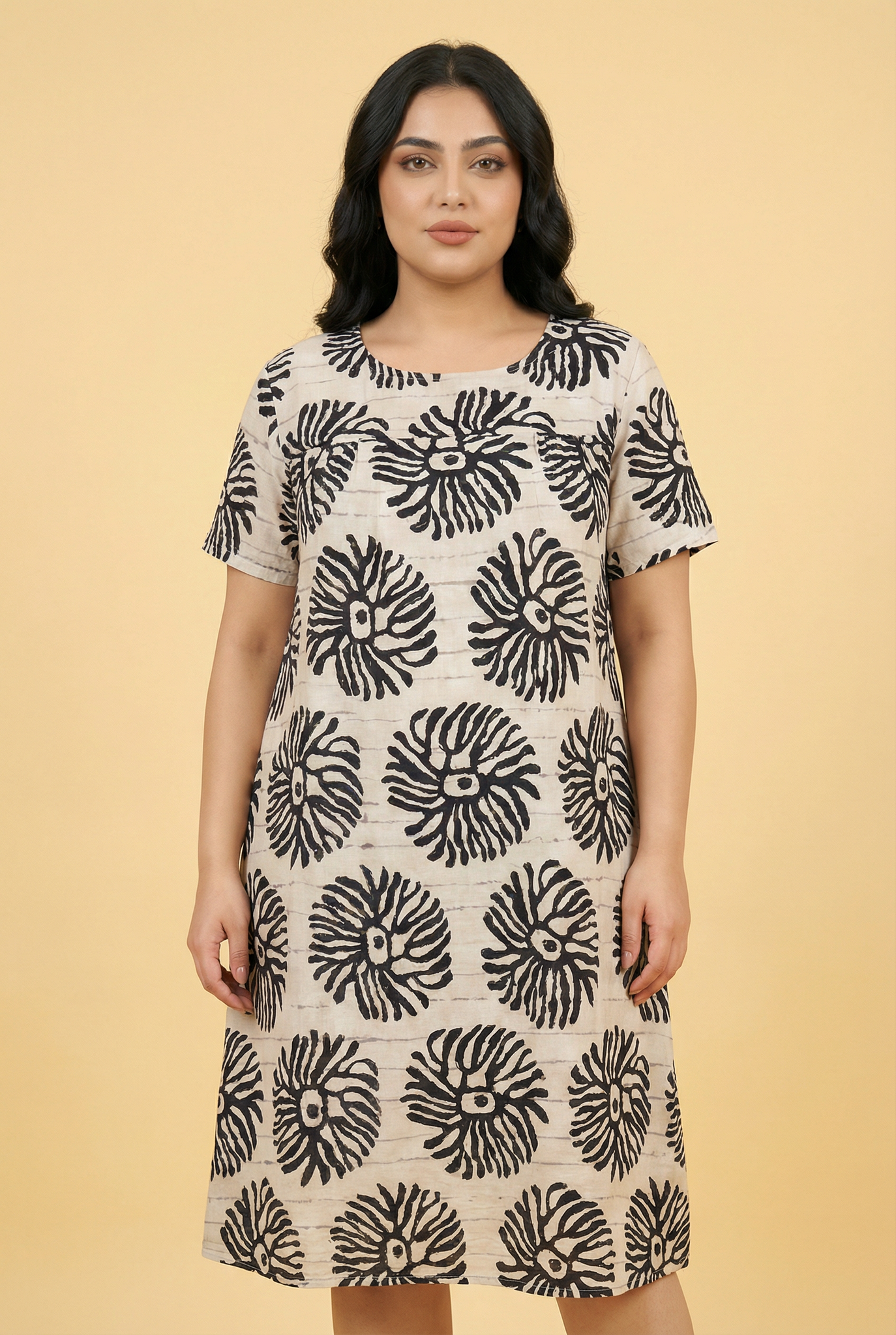 • A loose-fitting midi dress with short sleeves, featuring a repeating radial floral (or sunburst-like) pattern that adds artistic texture.