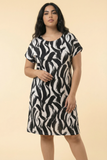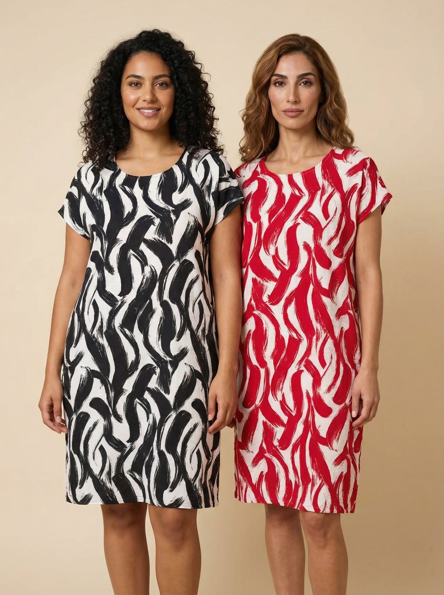 • A short-sleeved midi dress with a relaxed silhouette, featuring bold brushstroke-style abstract patterns in two color schemes: black-white and red-white.