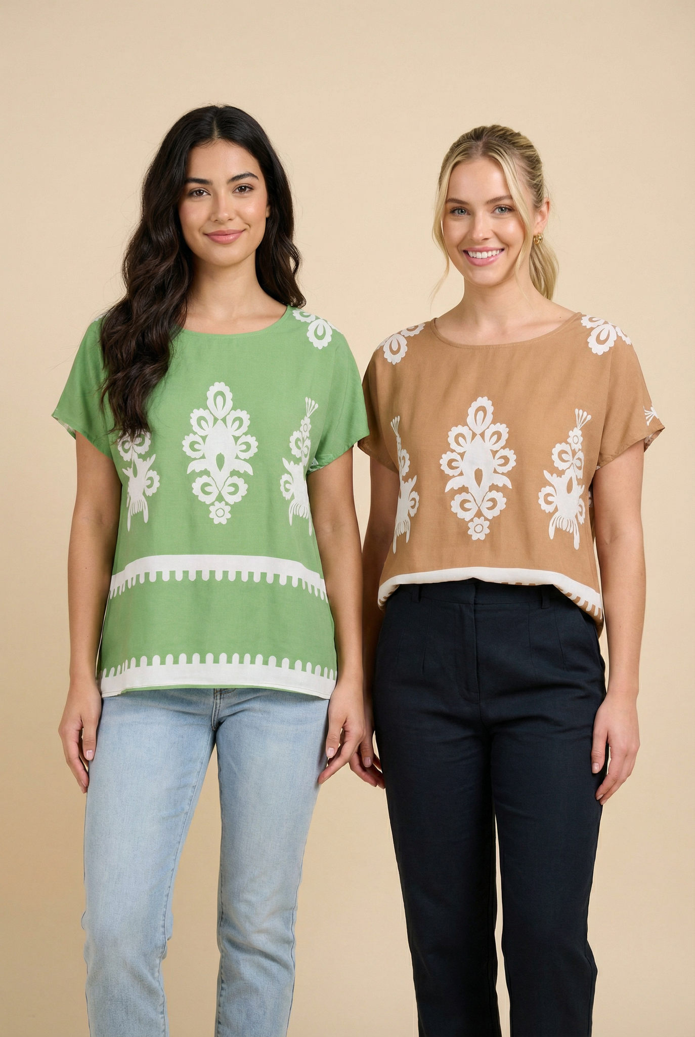 • Design Details: Features bold, white folk-inspired floral/scrollwork embroidery (paired with decorative scalloped borders) that adds artisanal charm—balancing intricate detail with a clean, structured look. The relaxed fit and rounded neck ensure effortless wearability.