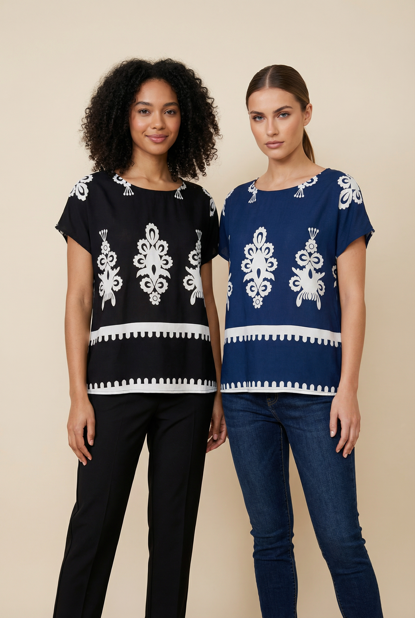 This short-sleeve blouse blends traditional folk embroidery motifs with modern relaxed styling, available in black (with white details) and navy blue (with white details).