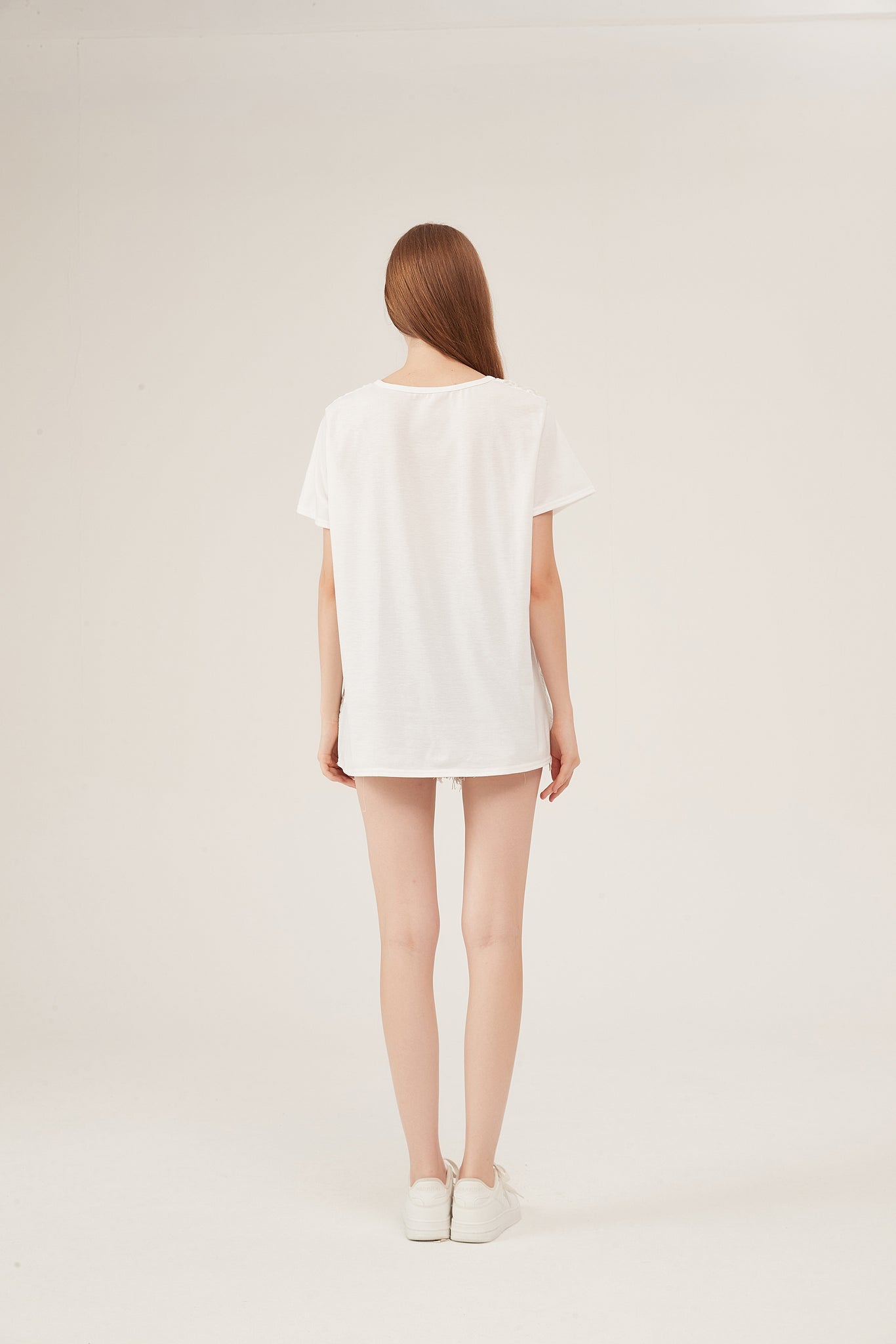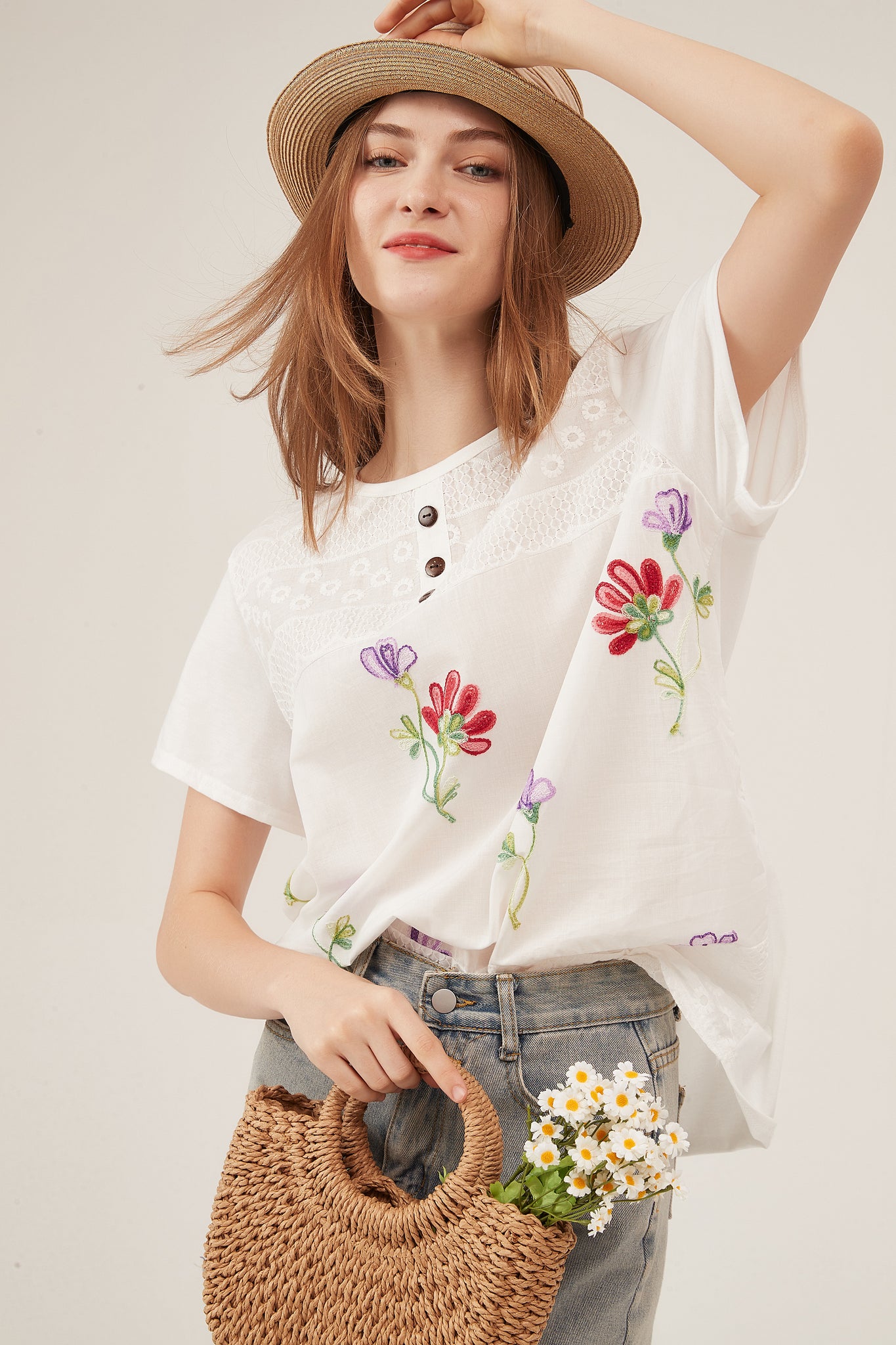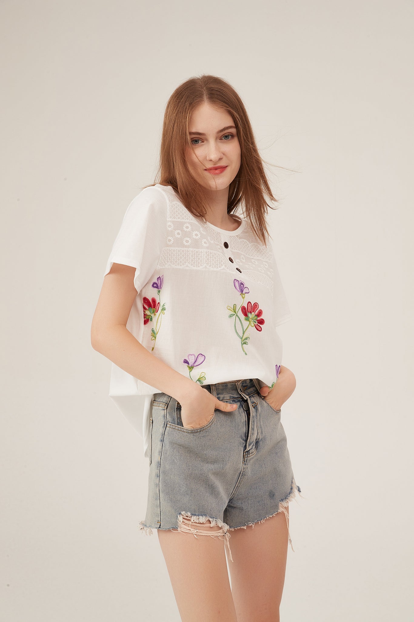 This elegant loose white blouse weaves delicate craftsmanship with effortless charm, making it a standout staple for polished casual looks. It features intricate eyelet lace panels on the upper chest and hem—adding soft, romantic texture that elevates the relaxed silhouette—paired with three dark decorative buttons on the chest for a subtle, refined focal point. The front is adorned with vibrant floral embroidery: bold red blooms, soft purple flowers, and fresh green stems create a handcrafted, spring-inspired vibe that feels both playful and sophisticated. Crafted from lightweight, breathable fabric, the oversized fit ensures all-day comfort while flattering diverse body types, and it pairs seamlessly with denim shorts, flowy skirts, or tailored trousers—perfect for weekend outings, casual work settings, or relaxed social gatherings. This piece balances refined details with everyday versatility, offering a polished yet easy-to-wear option for any occasion.