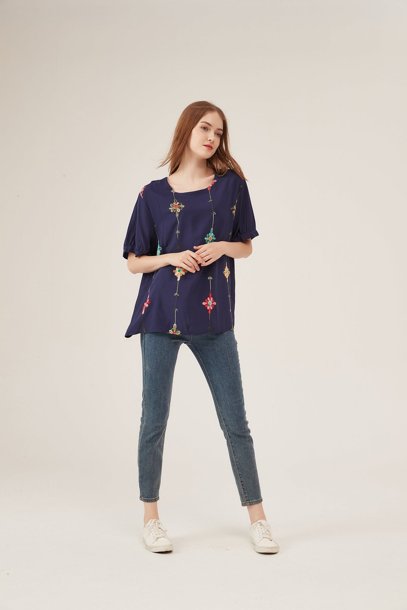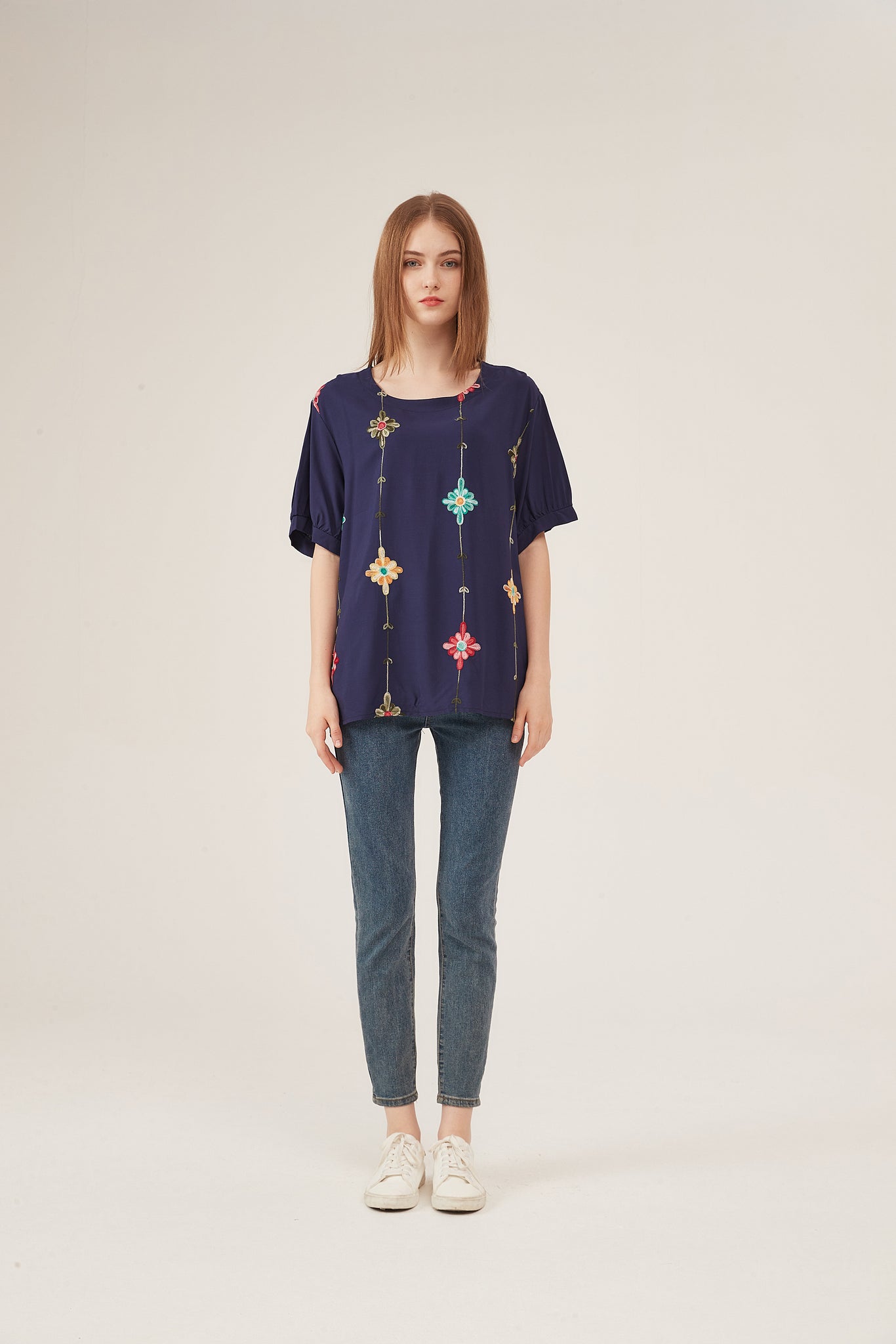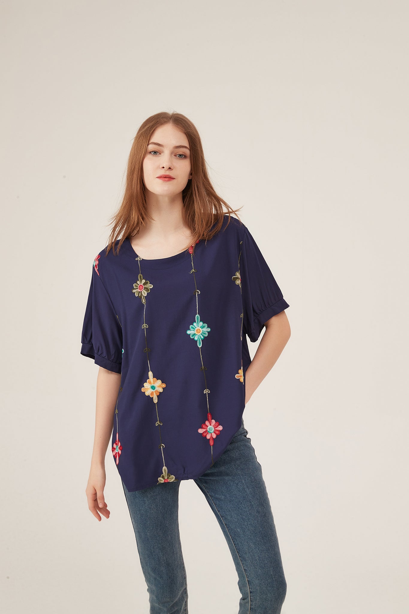 This rich navy blue loose blouse blends bold color with playful artistry, creating a striking yet versatile piece for everyday styling. It features vibrant, multi-colored floral embroidery (red, teal, orange blooms) arranged in vertical chains, adding a handcrafted, bohemian-inspired charm that pops against the deep navy fabric. The puff sleeves with subtle gathers lend a soft, feminine silhouette, while the lightweight, flowy material ensures breathability and comfort. The oversized fit flatters all body types and pairs seamlessly with denim jeans, white trousers, or midi skirts—ideal for casual outings, office days, or relaxed social events. This piece balances vibrant detail with effortless wearability, offering a timeless yet eye-catching option that transitions smoothly between occasions.